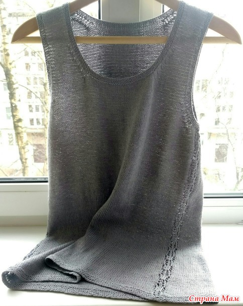 Топ вязала снизу вверх вкруговую. Чтобы не было скучно вязать лицевую гладь, решила по бокам сделать ажурные дорожки и слегка приталила. Обвязала тоже платочной вязкой.