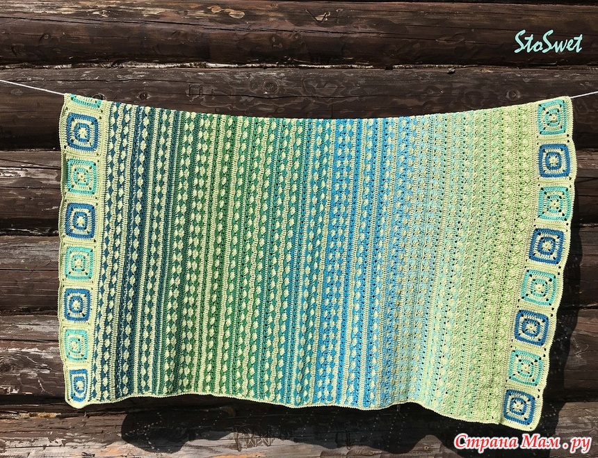 О пряже Ярнард Фловерс- мягкая, идеально подходит для пледов, так как чередовала ряды-1 ряд Фловерс и 1 ряд Ирис светло салатового цвета, поэтому получился длинный плавный переход от светлого к темному.