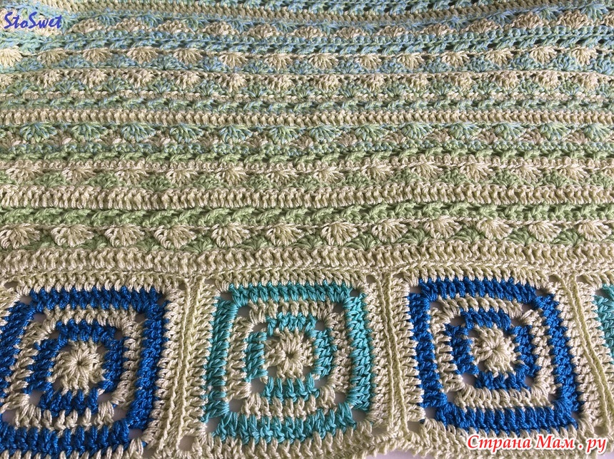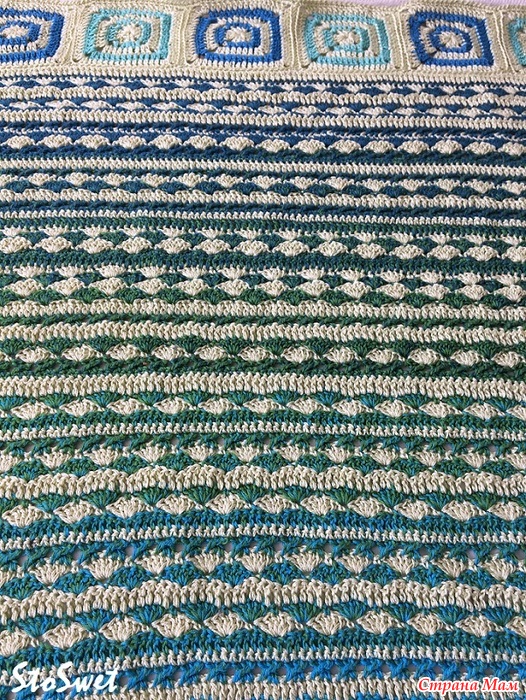 Плед "Лагуна" связан из пряжи Ирис (ПНК им.Кирова) 300 грамм -1800 метров хлопок мерсеризированный, Ярнард Фловерс 55% хлопок, 45% полиакрил (1000 метров-250 грамм) ,пряжа Пеликан (Vita cotton)- в 50граммах-330 метров.