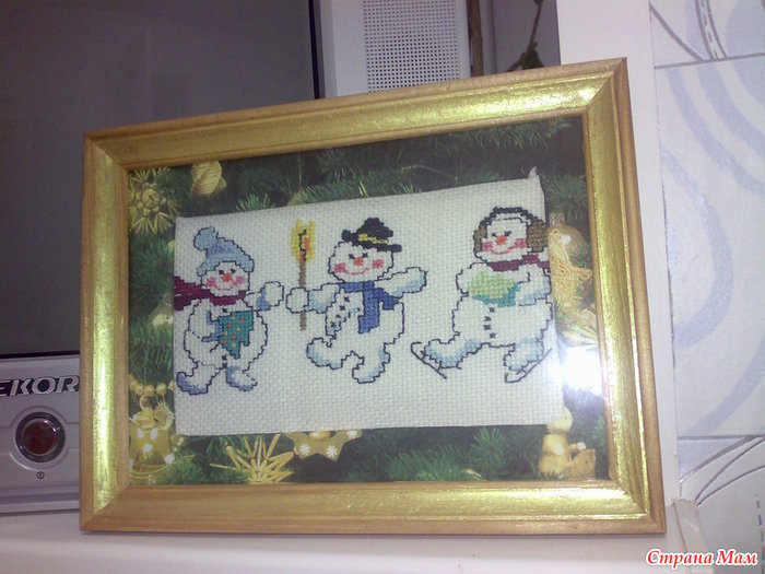 Наступил декабрь, а вместе с ним и новогоднее настроение. Откопала вышитых несколько лет назад снеговичов и решила самостоятельно оформить их в рамку с паспарту. Рамочку взяла самую простую, частично покрыла её золотистым лаком для ногтей, так как ничего более подходящего под рукой не нашлось. Паспарту тоже делала сама: за основу взяла потолочную плитку, вырезала из неё заготовку паспарту, а затем оклеила её салфеткой с новогодними мотивами. Вот и всё! Быстро и просто! И по-моему симпатично.