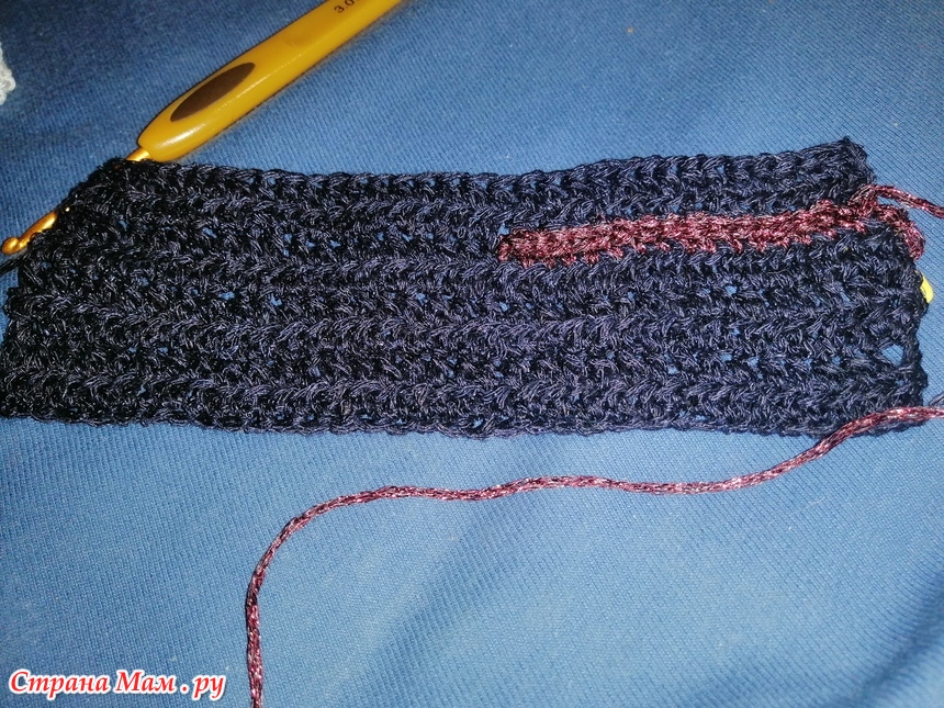 Поворачиваем вязание и присоединяем контрастную нить (КЦ)