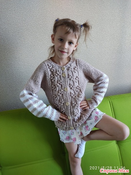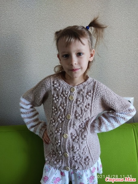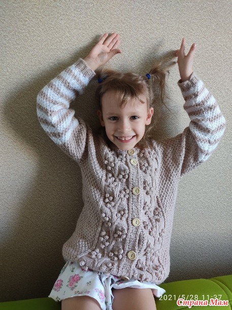 Лежали у меня два мотка Нимфа от фирмы Камтекс с не известных времён. Вот пристроила, связала внучке жакетик. На рукавах добавила хеппи беби. Спицы 2,5.