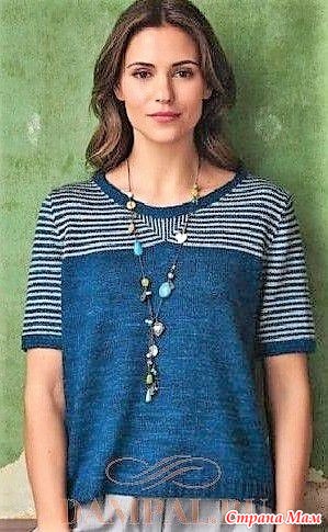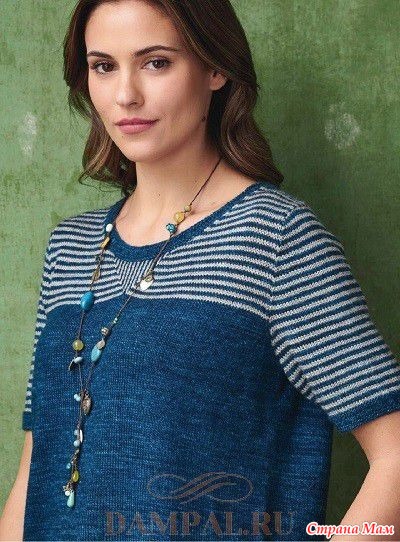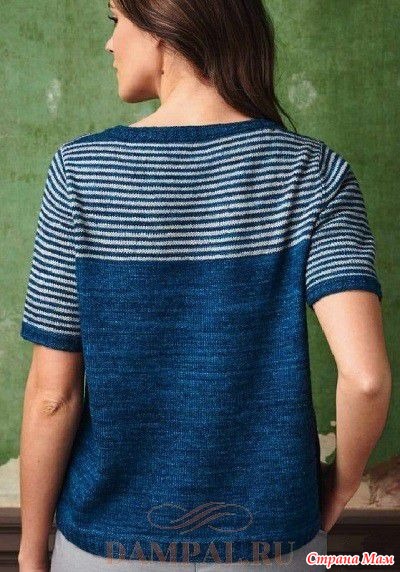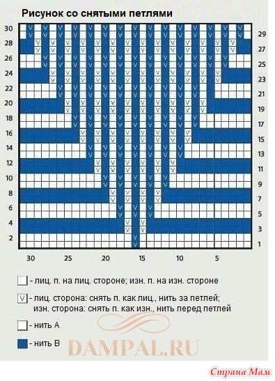 Рукава вяжутся полосатым рисунком, начиная с полоски нитью В. Цвет нити меняется через каждые 2 ряда.