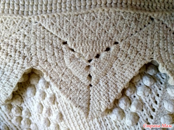 К сожалению, не получается сфотографировать его целиком, только фрагменты. Размер покрывала 1,5х2 м. Связано очень плотно из толстого хлопка. Очень тяжелое.