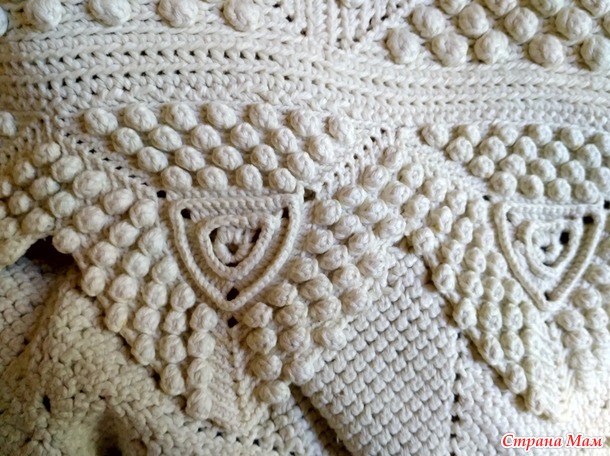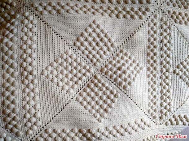 К сожалению, не получается сфотографировать его целиком, только фрагменты. Размер покрывала 1,5х2 м. Связано очень плотно из толстого хлопка. Очень тяжелое.