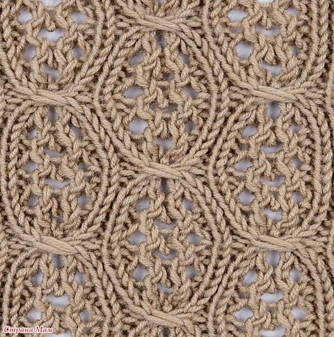 В изн. р. все петли вязать по рисунку, накиды – изнаночными. Из 2 идущих подряд накидов первый провязать изн., второй – лиц. 1–18-й р. постоянно повторять.
