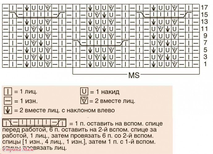 В лиц. р. вязать по схеме, при этом начать с 1 кром., раппорт постоянно повторять, закончить петлями после раппорта и кром.