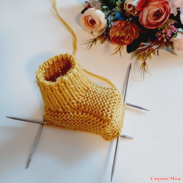 Как связать боковую часть пинеток: по боковым частям набираем по 7/9 петель и вяжем платочной вязкойпо кругу 12/14 рядов.