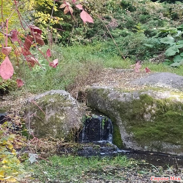 Водопад в гроте Калипсо. Раньше это место называлось гротом Льва, или гротом Потоцкого. Граф Потоцкий написал здесь на польском языке: "Кто несчастлив, то пусть зайдет и станет счастливым, а кто счастлив, пусть станет еще счастливее".
