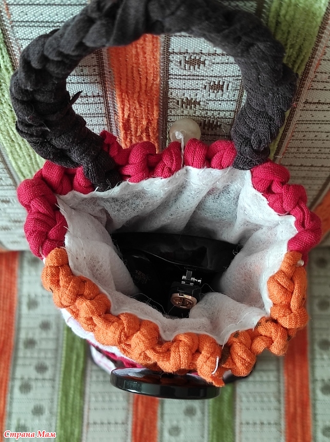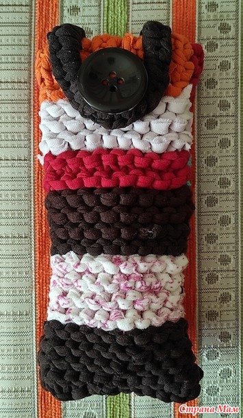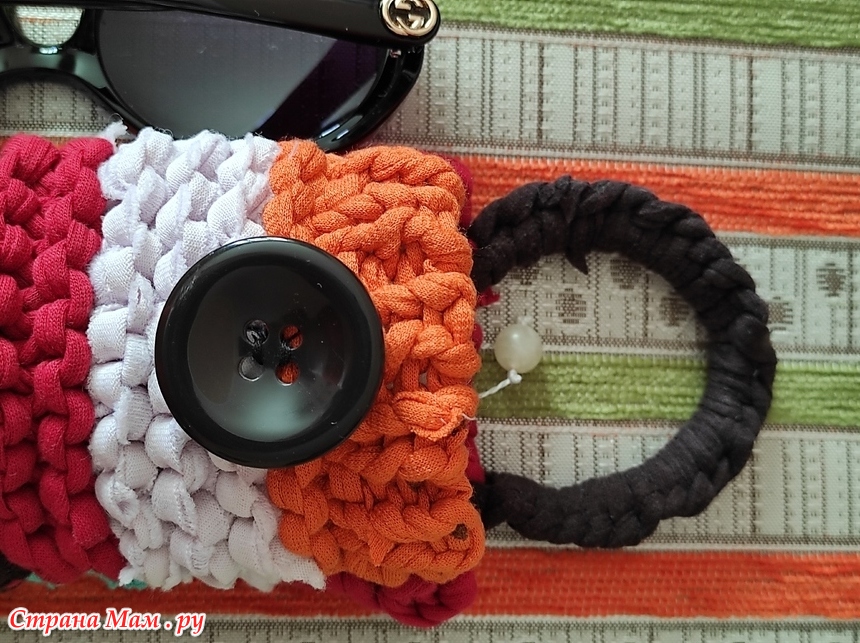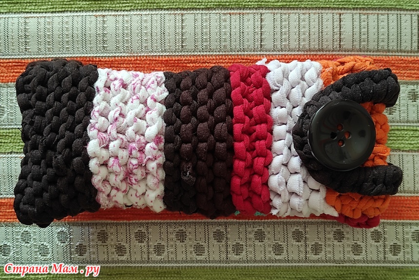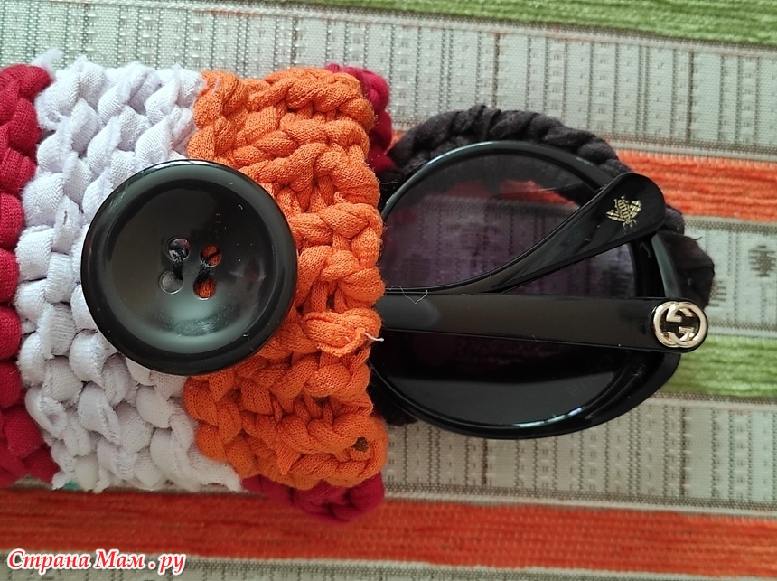 Вязала спицами №8 из того, что было. Практически из мусора. Получилась что-то среднее между "тряпичной Энни" и бабушкиным половичком. Петлю-застёжку делала из этой же пряжи, пришила большую пуговицу, вшила подкладку. Получилась вещичка в этно-стиле. Чехол хорошо держит форму, эластичный (очки удобно вкладывать и доставать) и достаточно плотный для того, чтобы охранять солнечные очки от деформации в сумке.