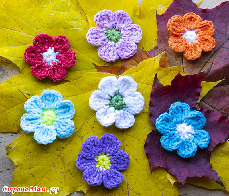 Такие цветочки можно связать из остатков любой пряжи, будь то акрил, хлопок или полушерсть. Я вязала из нескольких цветов YarnArt Jeans крючком № 2. Размер моих цветов — 4,5 см.