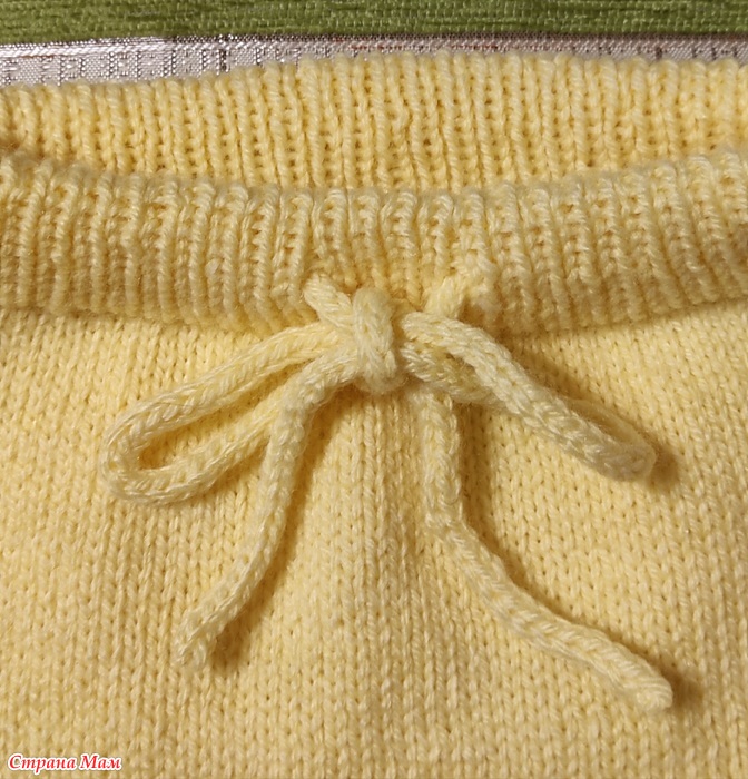 Штанишки вышли плотные, внешне хорошенькие, цыплячьего цвета, который неточно передают фото. На Марту уже примеряли, немного ей пока великоваты. Самой Марте больше всего понравились тесёмочки, она стала ими играть и пробовать на вкус. Мне прислали фото этого трогательного момента.