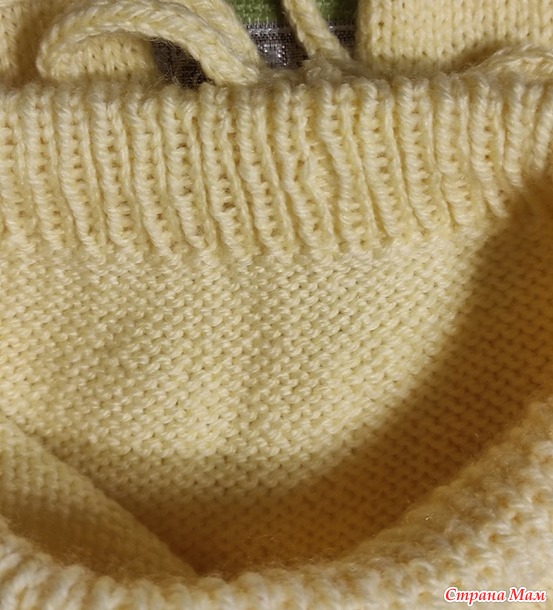 Ластовица. фильм 2, 2:36. Ластовица составляет 8% от общего количества петель. У меня это 10 петель. При расчёте количество петель округляется до чётных. Прибавления для ластовицы делаются по центру переда и спинки по обе стороны от центральной петли в нечётных рядах - 1, 3, 5, 7 и 9. Чётные ряды - без прибавок. По переду длина вместе с ластовицей и резинкой у меня получилась около 22,5 см.