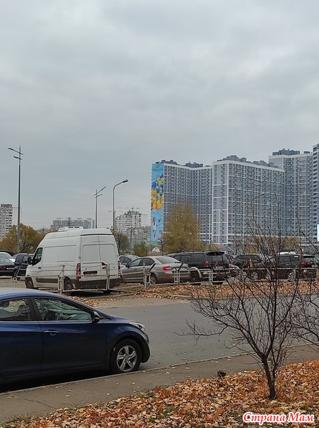 Теперь безотносительно к вязанию. Вчера шла утром к метро мимо стоянки. Погода хмурая-хмурая. Ближе к метро подняла взгляд и остолбенела. Оказывается, на стене дома с противоположной стороны проспекта появился красивейший мурал, который сильно выделяется на фоне серого неба. В солнечную погоду он сливался с синим цветом неба, видимо, поэтому я не обращала на него раньше внимания. А хмурой осенью вдруг увидела. Фотографировала издалека. В Киеве и в центре, и на окраинах очень много красивых тематических муралов.