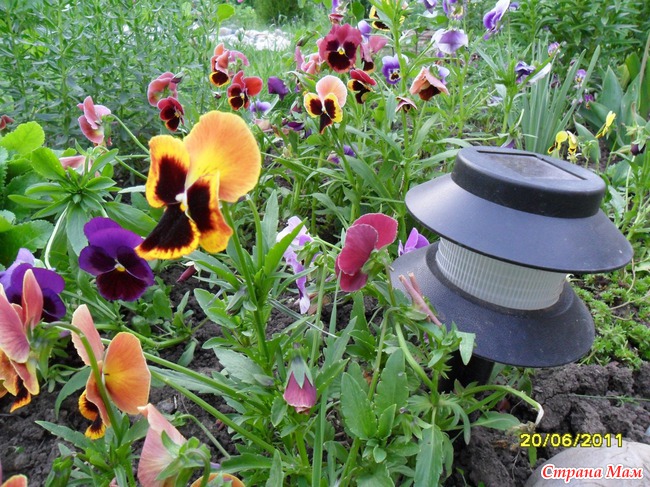 На цветнике перед домом цветут анютки и турецкая гвоздика, зацвели лилии