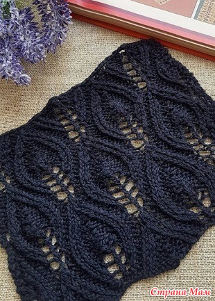 Предлагаю в копилочку рукодельницам красивый ажурный узор спицами с просторов интернета. Этим узором можно вязать очаровательные пуловеры и жакеты. Данный ажур представляет собой чередование листиков в шахматном порядке. Наиболее выигрышно этот узор выглядит, если вязать его из пряжи темных цветов. Рекомендуется взять спицы номер 4 или номер 5, можно взять любую пряжу, как натурального, 100 процентного состава, так и смесовую или искусственную, например, полиэстер.