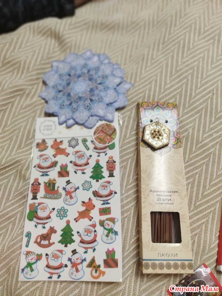 Внутри мы нашли вот такие большие снежинки на окна и маленькие наклейки и ароматические палочки с поставкой! Давным давно потеряла свою подставочку и все не доходили руки купить, а я это дело очень люблю.