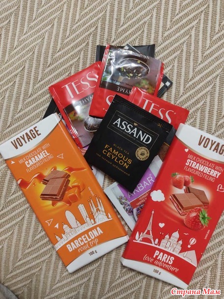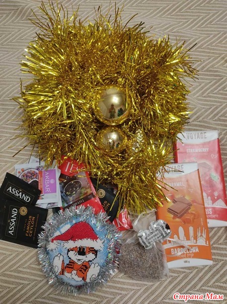 Также среди подарочков были сладости, чай, мишура и елочные шарики, а также мешочек лаванды, который тоже был в моем альбоме хотелок. Шоколадок таких у нас не продают, карамельную уже попробовали, очень вкусная.