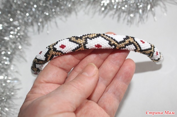 Серебристо снежные оттенки переплелись с яркой золотой ниткой японского бисера. Сочная капля алых бусин на белом перламутре словно знак невинности после первой брачной ночи. Тонкая иллюзия целомудрия. Чего-то такого чистого, непорочного и светлого. Почему-то глядя на это сочетание хочется верить в честность людей, бесхитростность бытия и человеколюбие. Понимаю, что изделие никак не связано с мыслями описанными мной в этих строках, но первое впечатление от увиденного было именно такое.