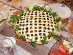 Украшаем:с кукурузы хорошо отжать сок, выложить на яйца, на кукурузе нарисовать сетку(у пачки майонеза тонко отрезать кончик),маслины порезать на небольшие кусочки и разложить в клеточках,по бокам чипсы и зелень. дать салату часика3-4 пропитаться. очень вкусный салат! приятного всем аппетита!