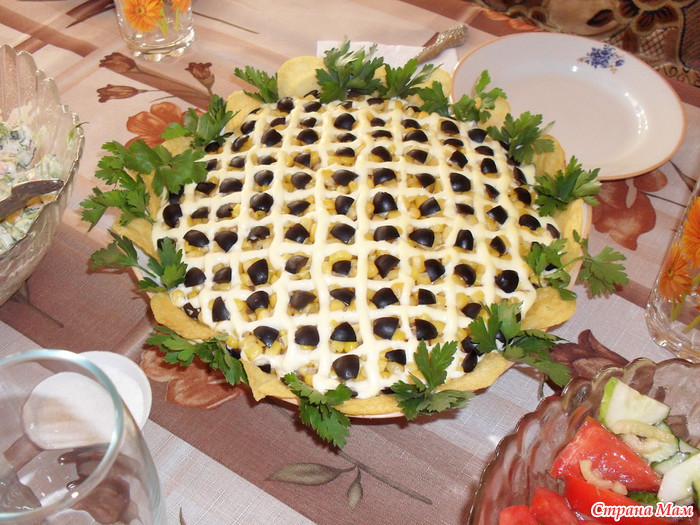 Украшаем:с кукурузы хорошо отжать сок, выложить на яйца, на кукурузе нарисовать сетку(у пачки майонеза тонко отрезать кончик),маслины порезать на небольшие кусочки и разложить в клеточках,по бокам чипсы и зелень. дать салату часика3-4 пропитаться. очень вкусный салат! приятного всем аппетита!