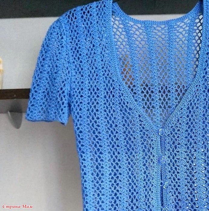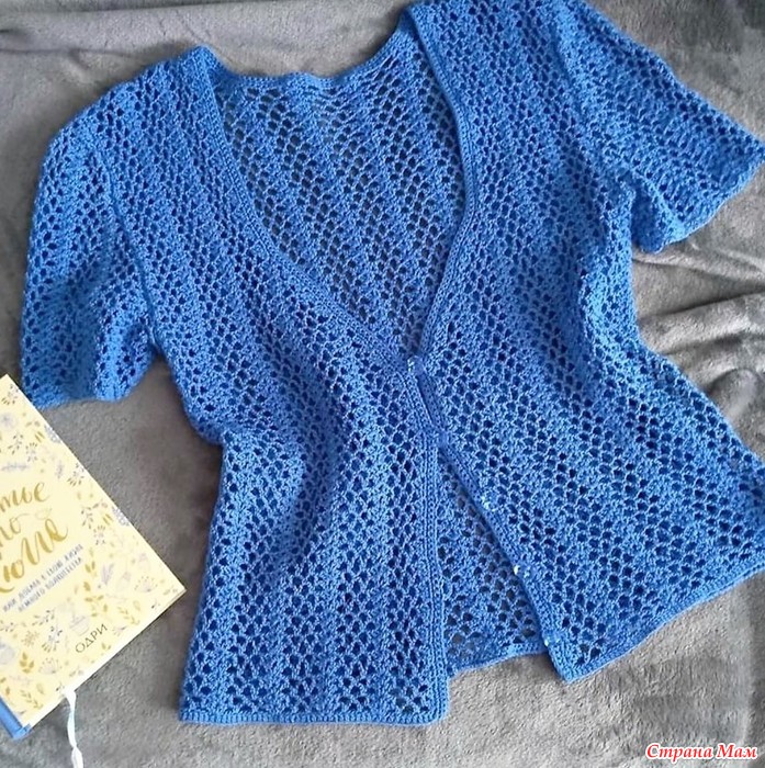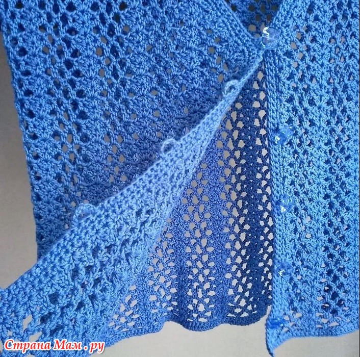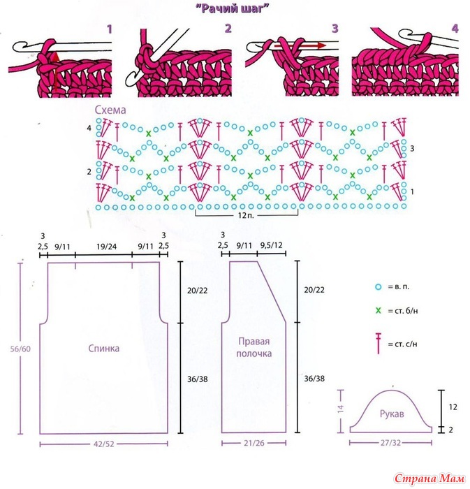 Сборка: выполнить плечевые, боковые швы и швы рукавов; втачать рукава. Обвязать края всего изделия 1 р. ст. б/н. и 1 р. ст. «рачий шаг».
