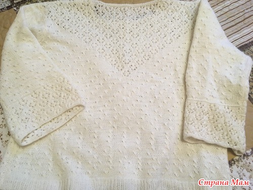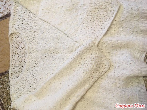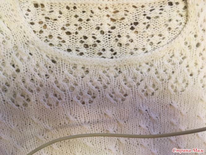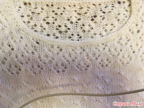 Пройму рукава вязать аналогично передней части. Горловину вязать на высоте 64 рядов от начала проймы рукава.