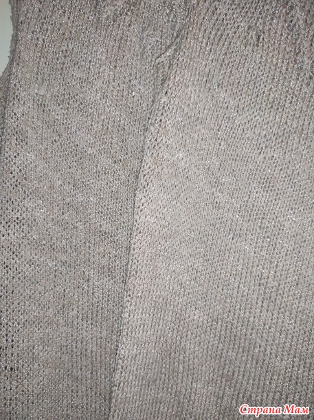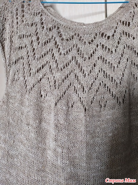 Но у меня же оставалось еще 200 грамм шелка. решила, будет топик. Потом подумала, а не купить ли бы мне еще нить, дополнительную... Зашла в магазинчик с пряжей, а там продавец мне показывает бобинку - остаток итальянского хлопка того же цвета и веса - 200 грамм. Подумали и решили соединить шелк одну нитку (700м/100гр.)и хлопок две нити (1400м/100гр.) В магазине размотали мне на две бобины по 100 грамм. Поэтому в процессе вязания были три нити, вели себя прекрасно, не путались. Спицы те же. Схема другая.