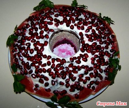 дать салату пропитаться в течении 5 часов, и только потом вынуть стакан. Гранатовый браслет готов.