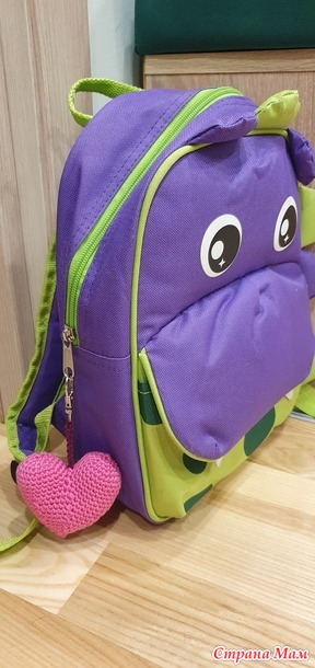 Не знаю, почему, но сердечко у меня получилось кривоватое... хотя я и по описанию делала, и видео посмотрела... Загадка. К счастью, дочке оно все равно понравилось и она сразу прицепила его себе на рюкзак: