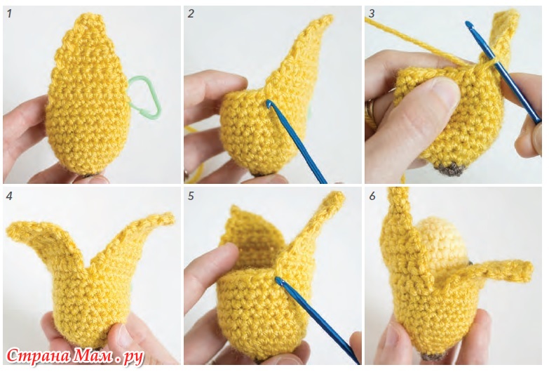 Прикрепляя нить соответственно в 9й и 17й столбики 10го ряда, связать еще две части кожуры, повторяя ряды 11-19.