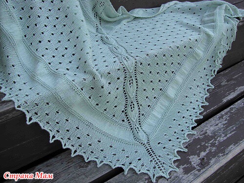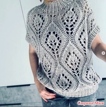 Здесь всего лишь чулочная, платочная вязки и ажур: накид, 2 вместе каждые 4 петли и в каждом 6 ряду. Добавки в начале 1п, середине 2п и конце 1п каждого второго ряда. Листочек в ценре обычный, можно взять схему любого, если нужно более чёткие фото, обращайтесь. Всё очень просто, вяжется на одном дыхании.