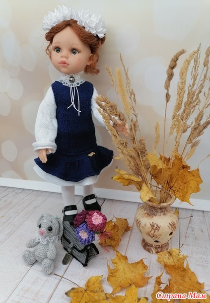 Наряд связан спицами 1,2мм . Пряжа для кофточки Alize Cotton Gold FINE, для сарафана YarnArt Cotton soft. Портфель из пехорки успешной, крючок 1, цветы из ириса.