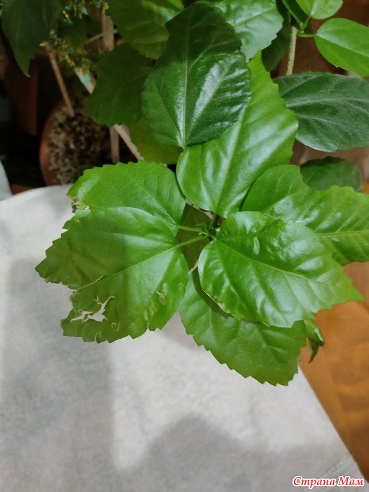 Показалось вроде листья не блестят: по хорошему надо бы его под душ отправить- но тяжёлый,думаю попрыскаю пока,стала осматривать и вижу прогрызеные листья- но только в том месте ,где ветка свешивается над столом.