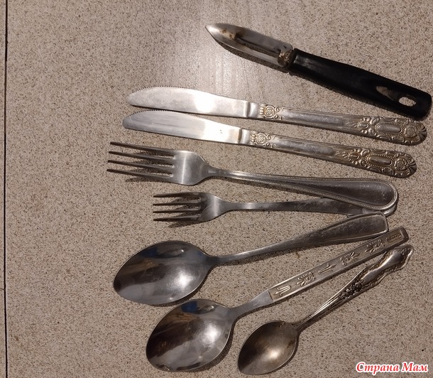 А чистим так: в кастрюлю с высокими бортами на дно выкладываем пищевую алюминиевую фольгу, можно даже взять от шоколада, немного ее смять, что бы не ровным листом на дне лежала, сверху приборы которые будем чистить, залить водой, чтобы все покрыло и нагреваем до кипения. Когда вода закипит, огонь убавляем и понемногу добавляем пищевую соду, примерно по 0,5 ч.л.. Будет идти хим.реакция, как только перестанет еще подсыпать соды. Минут 5 так кипятить. Достаем по одному предмету, вытираем льняной салфеткой или вафельным полотенцем, чтобы снять остатки налета. В труднодоступных местах почистить щеткой. И только потом ополоснуть.