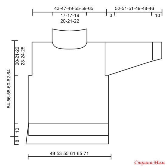 Когда высота детали будет равна 42-43-44-45-46-47 см, в начале следующих 2 рядов закрыть по 3 петли для пройм = 43-47-49-55-59-65 петель.