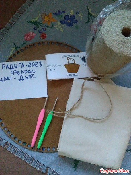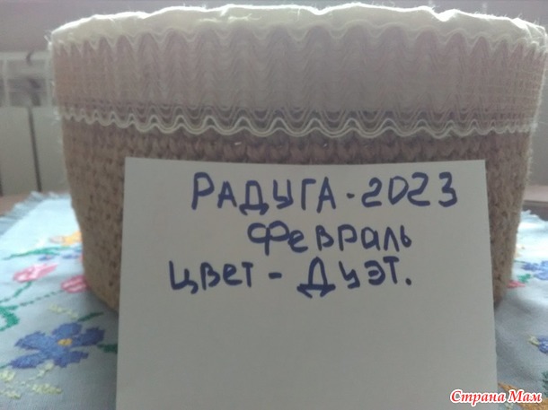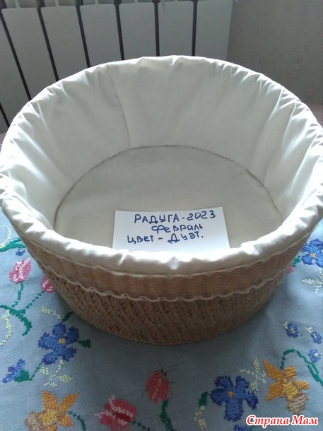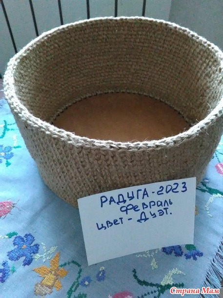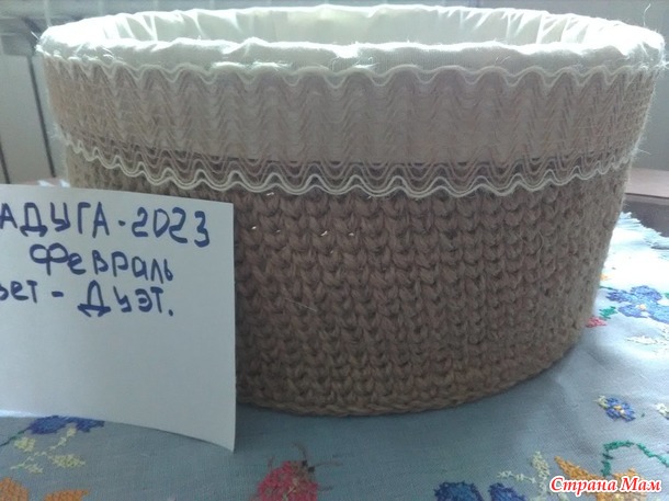 Доброе время суток! Сегодня отчёт за февраль цвет - Дуэт. Корзина - диаметр 30 см., высота - 17 см. Материалы - джут, бязь, кружевная лента джутовая. Связана в две нити, крючок 4. Начло было не очень привлекательным, я уже писала правая рука совсем стёрта до глубоких ран (в данный момент хорошо заживших). Ну а дальше всё как по маслу. С предназначением корзины пока не определилась, но есть варианты. В конце отчёта будут фото.