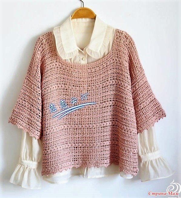 Летний джемпер с рукавами до локтей и глубоким вырезом вяжется в поперечном направлении интересным узором с лиственными элементами. Благодаря свободному силуэту он подойдет на любую фигуру.