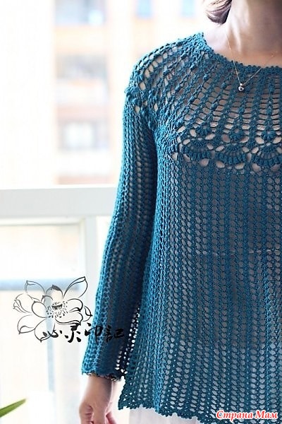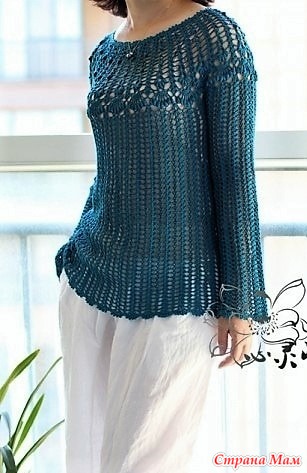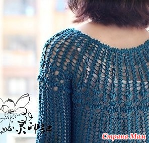 Голубой ажурный джемпер с круглой кокеткой красивым узором.