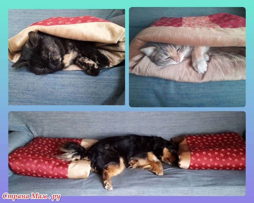 Только сшила. В первый день кошку-маму внутрь садила - спала в норке. А вчера-сегодня теплее было, спали сверху. Думаю, к следующей зиме привыкнут и полюбят норки.