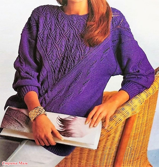 Эффектный лиловый джемпер с красивой ажурной кокеткой. Спицы.