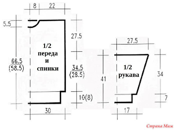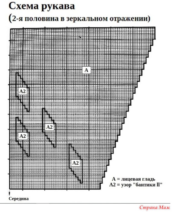 На спицы № 2,5 набрать 48 п. и связать 7 см резинкой, равномерно прибавить в последнем ряду 34 п. = 82 п. Далее вязать по схеме рукава спицами № 3,5. Вторую половину рукава вязать узором «бантики I» в зеркальном отражении.