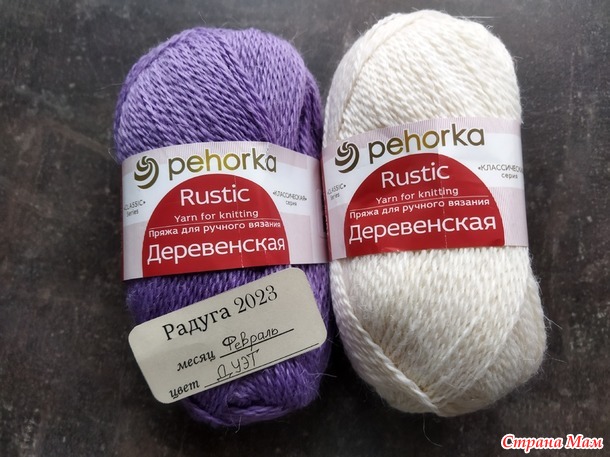 Пряжа: Пехорка Деревенская (100% шерсть, 100г -250м, цвет 516 (Персидская сирень) и 01 (Белый)) каждого цвета по 200 г
