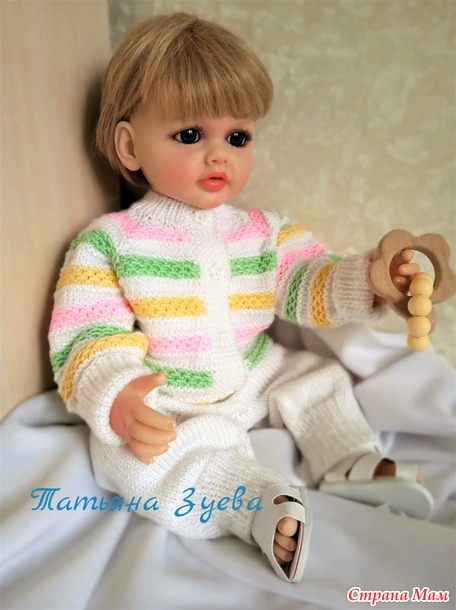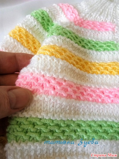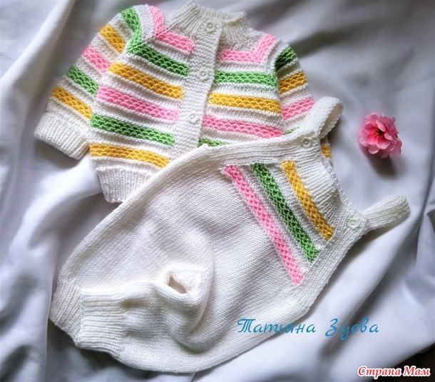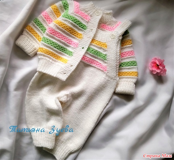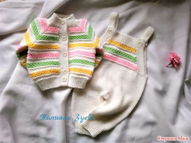 Вот девочки, я снова со своими "похвастушками! Связался у меня костюмчик на девочку 0-3 месяца. Пряжа Ализе Бэби Бест 100гр/240м, в 4 расцветках и полукомбинезон. Кофточка реглан сверху. Полукомбинезон - над ним я думала, куда вставить полоски?) Или на брючины по бокам или снизу! Остановилась на грудке! Спицы 3,5 ( основное вязание), спицы 3,0 манжеты, воротник. Понравился узор. Где-то встретила в свободном доступе, сейчас не могу вспомнить, то ли на Ютубе, то ли в Пинтерест. Расход - почти 2 мотка белого цвета и по чуть чуть остальных цветов! Мне нравится моя работа! А как Вам?)
