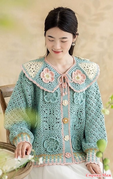 Романтический жакет со съемным воротником из мотивов украшенных объемными цветами. Крючок.
