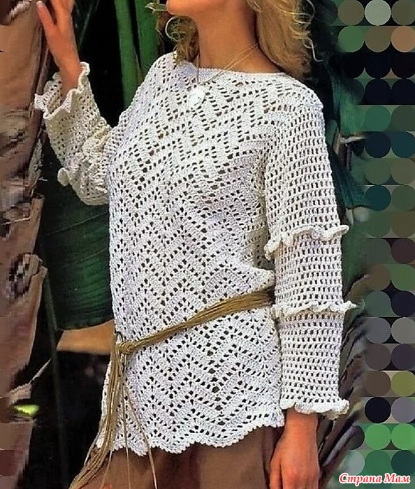 Обвязать рукава 3-мя рюшами. Для этого в возд. п. между 2 ст. с/н вязать по 3 ст. с/н. Таким образом обвязать нижний край, 14-й и 24-й ряды (рюши вязать сверху вниз).