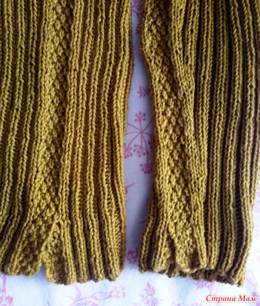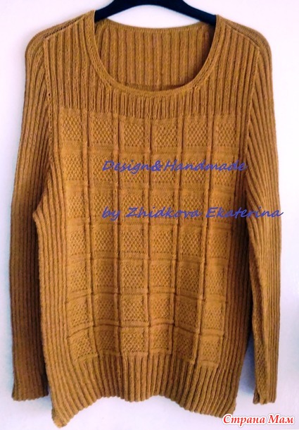 Как обычно, для своих работ я беру какой-то рисунок за основу, а остальное придумываю сама. Так и на этот раз – узор решила расположить посередине, по бокам резинка 2*2. Небольшие шлицы «рисом», переходящим в полосу. Такие же шлицы и полоса и на рукавах.