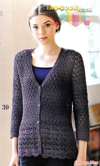 Ажурный жакет подол которого выполнен веерным узором. Крючок.
