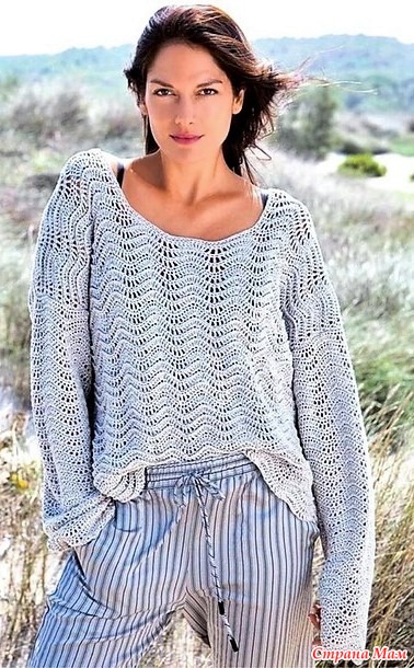 Ажурный пуловер оверсайз волнистым узором. Крючок.