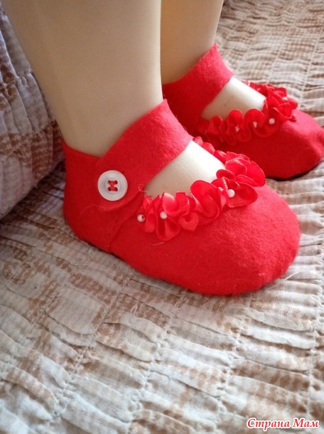 Начало работы: выкроила носок и пяточную части из красного фетра, подошву из тонкого картона, стельки из коричневого фетра.